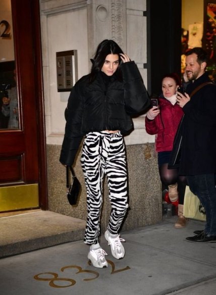 Накануне знаменитость попала в объективы фотографов, когда перемещалась с показа на показ в Нью-Йорке. Она надела широкие брюки в черно-белую полоску. Кендалл Дженнер доказывает, что в принте "зебра" будет стильной любая одежда, а не только пальто. На верх она наела короткую черную куртку, а обула белые массивные кроссовки.