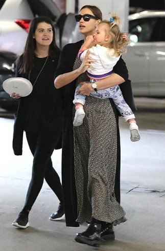 Шейк привезла малышку в развивающий центр Kidville, где дети могут не только поиграть, но и принять участие в различных творческих мастер-классах. На публике Ирина появилась в длинном черно-белом платье, черном кардигане и грубых ботинках. Лею, которая была одета в голубые штаны с узорами и белую худи, она несла на руках.