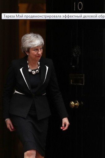 Тереза Мэй продемонстрировала эффектный деловой образ в черном платье-футляре и жакете того же цвета с белыми вставками.