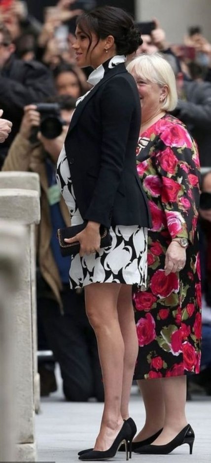 Для сольного выхода в свет Меган Маркл выбрала смелый образ: черно-белое мини-платье, которое не только подчеркнуло живот, но и высоко открывало стройные ноги будущей мамы. Платье выглядело особенно фривольно, когда герцогиня сидела, закинув нога на ногу.