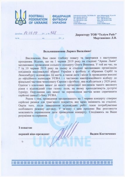 "Відомо, що на 1 червня 2019 року на стадіоні "Арена Львів" заплановано проведення сольного концерту Олега Винника. У той же час, на 7 та 10 червня 2019 року на цьому ж стадіоні заплановано організацію поєдинків національної збірної України з футболу зі збірними Сербії та Люксембургу відповідно. Ці матчі, а також дати і місце їх проведення внесені до офіційного календаря УЄФА і є частиною кваліфікаційного відбору до фінальної частини чемпіонату Європи з футболу, яка відбудеться у 2020 році. Однією з ключових вимог до якості організації поєдинків такого високого рівня є відповідний стан газону поля, на якому проходитимуть зустрічі турніру. Порушення цих вимог чи перенесення матчів може спричинити серйозні санкції з боку УЄФА. Разом з тим, проведення запланованого на 1 червня концерту створює серйозні ризики для трав’яного покриття, яке зараз змінюють на стадіоні. У зв’язку з цим просимо Вас розглянути можливість перенесення дати проведення концерту", – говорится в письме.