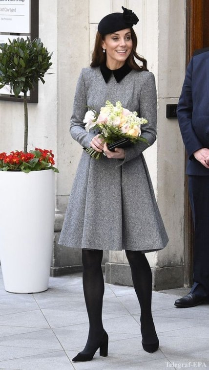 Для светского выхода в Королевский колледж герцогиня Кембриджская выбрала серое платье Catherine Walker, черные колготки и туфли на невысоком каблуку. Свой образ Кейт Миддлтон дополнила клатчем в тон и небольшой черной шляпкой.