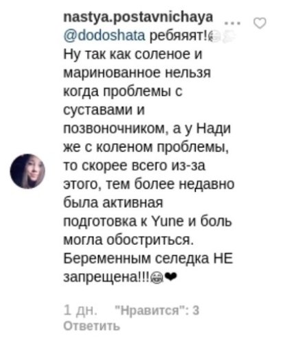 "Ну так как соленое и маринованное нельзя когда проблемы с суставами и позвоночником, а у Нади же с коленом проблемы, то скорее всего из-за этого, тем более недавно была активная подготовка к Yuna и боль могла обостриться. Беременным селедка НЕ запрещена!!!"