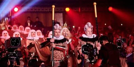 Звезда облачилась в наряд королевы - красный кожаный корсет с белой и золотой отделкой, с пышными рукавами, отделанными кружевом. Свита несла за звездой 18-метровый золотой шлейф.