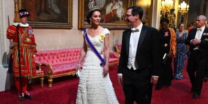 Для встречи с американскими гостями она выбрала элегантное белоснежное платье от дизайнера Alexander McQueen. Головным убором Кейт Миддлтон выбрала одну из тиар королевы Елизаветы II, а именно тиара под названием "Узелки любви". Нежный образ герцогини дополняли бриллиантовые серьги с сапфирами и браслет из жемчугов.