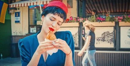 В новом амплуа украинская звезда предстает перед нами в длинном, синем ретроплатье. Астафьева стоит в очереди за излюбленным блюдом киевлян, а именно перепичкой с сосиской. Уточним, что это единственное блюдо, которое подается в заведении "Киевская перепичка".