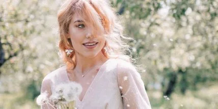 Девушка снялась в шелковом белом топе и пышной белой юбке гофре. Бретелька майки ниспадает на плечо модели и слегка приоткрывает плечо, что выглядит нежно и при этом очень эффектно.