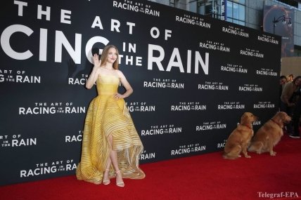 Компанию на красной дорожке актрисе составили ее партнер по фильму Майло Вентимилья и четвероногие друзья, которые тоже участвовали в съемках.