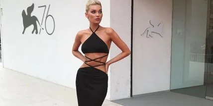 Шведская модель Эльза Хоск выглядела очаровательно в черном платье из коллекции Etro с завязками на животе, подчеркнув свою стройную талию.