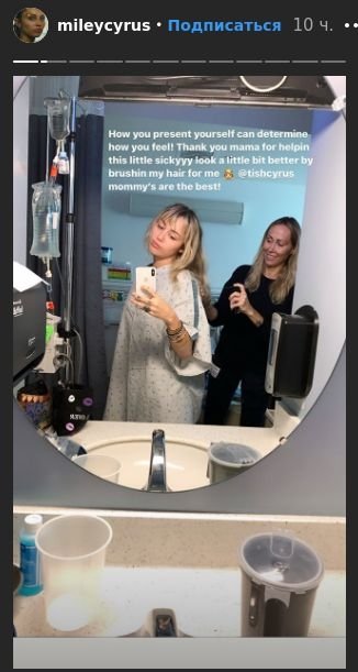 На данный момент певица находится не только под присмотром врачей, но и мамы Тиш Сайрус. На одном из фото Майли позирует перед камерой, когда родственница расчесывает ее волосы. Также, звездные друзья уже успели навестить артистку. Известно, что стилист Кеннет Брэдли и фотограф Майли Сайрус принесли ей цветы, а ее бойфренд Коди Симпсон пришел проведать любимую с гитарой и посвятил ей песню.