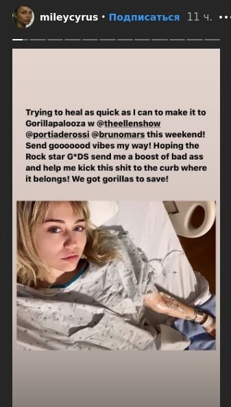 Известно, что Майли Сайрус – одна из активных блогерш, поэтому детали ее частной жизни часто попадают в сеть. На днях певица сообщила, что у нее врачи диагностировали тонзиллит, а уже 8 октября 2019 года она опубликовала снимки из больницы.