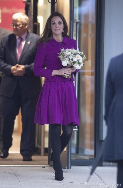 Сегодня в руках герцогини мы видим маленький черный клатч, она вновь надела плотные черные колготы, а туфли-лодочки выбрала в замше. Яркий образ королевской особы дополняет симпатичный дневной макияж и взъерошенная укладка. У герцогини, судя по снимкам, прекрасное настроение.