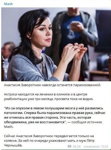 Телеграмм-аккаунт Mash сообщил о том, что Заворотнюк передвигается только на коляске, а за ней по очереди ухаживают мать и муж Петр Чернышев.