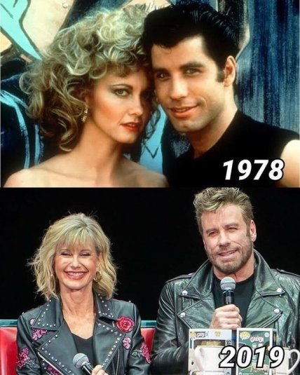 Траволта и Ньютон-Джон, сыгравшие влюбленных старшеклассников Дэнни и Сэнди в 1978 году, снова встретились и спели.