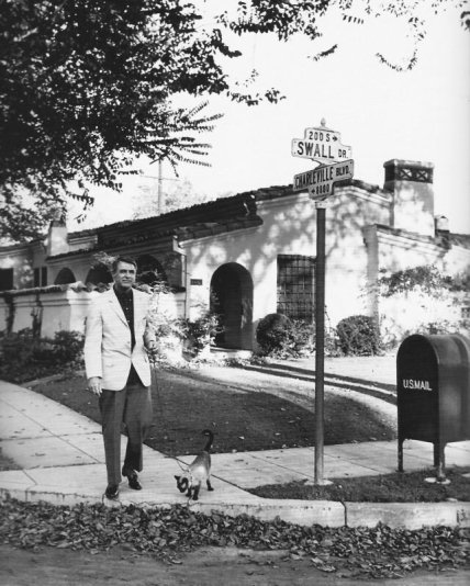 Кэри Грант выгуливает свою сиамскую кошку в Беверли-Хиллз, 1955