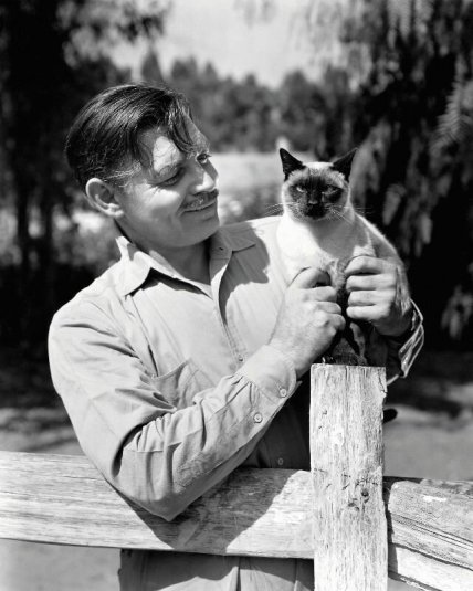 Кларк Гейбл позирует с одной из кошек, живших на его ранчо в долине Сан-Фернандо, 1945