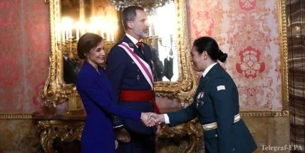 Королева Летиция вместе со своим мужем королем Филиппом VI посетили Новогодний военный парад в Королевском дворце в Мадриде.