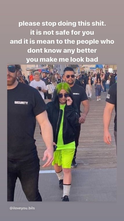 "Прекрати немедленно. Это небезопасно для тебя и жестоко по отношению к людям, которые не видят разницы. Ты меня подводишь", - написала рекордсменка "Грэмми-2020" в Stories.