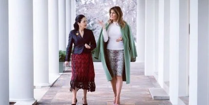 Согласно фотографиями, Мелания Трамп выбрала, как всегда, эффектный и трендовый образ. К чиновникам из Эквадора она вышла в питоновой приталенной юбке и белом блейзере. Первая леди накинула на плечи пальто мятного цвета, которое и стало ярким акцентом ее вида. Обувь на каблуках и идеальная укладка волос завершили look Мелании. В то же время 66-летняя Росио Гонсалес Навас красовалась в черно-красной юбке и пиджаке.