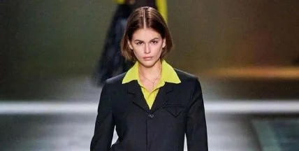 Для хрупкой красавицы дизайнер Энтони Ваккарелло подобрал весьма провокационный наряд. Кайя Гербер вышла к зрителям в латексном черном бюстгальтере и юбке. Образ манекенщицы дополнили горчичный жакет, клетчатый платок и сапоги на каблуке. Выглядела 18-летняя звезда очень сексуально.