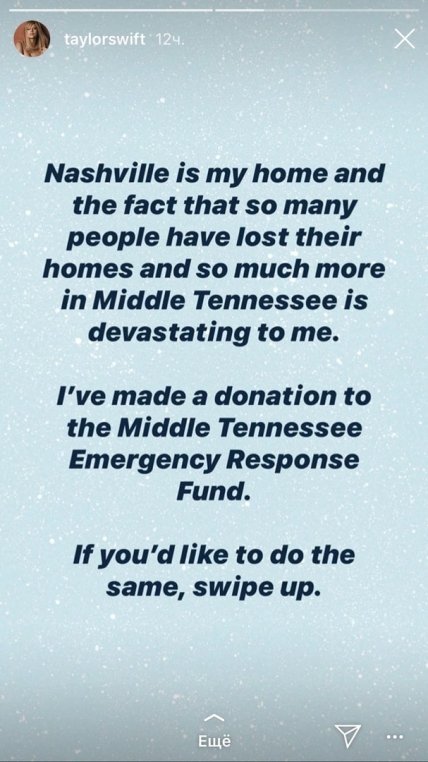 "Нэшвилл - мой дом. Новость о том, что многие жители Мидл Теннесси лишились своих домов, меня совершенно опустошила. Я сделала пожертвование для пострадавших в Мидл Теннесси в Теннессийский фонд экстренного реагирования. Если хотите сделать то же самое - проведите пальцем наверх", - написала Свифт в своем Instagram.