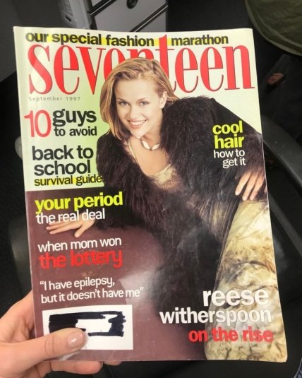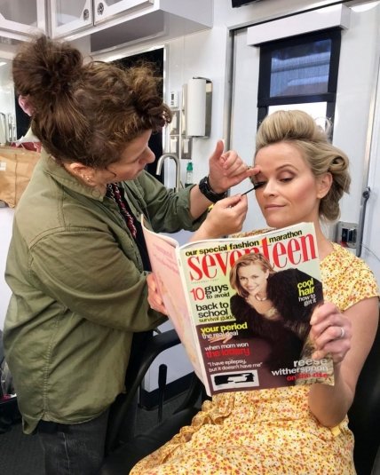 Выбор Риз пал на выпуск Seventeen, на обложке которого изображена она сама. Актриса держала в руках журнал, пока стилист занималась ее прической.