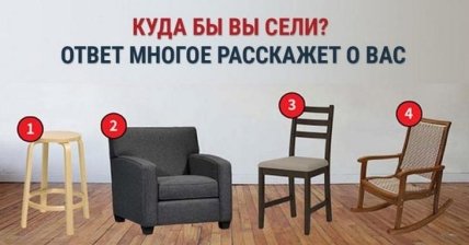 Если вы выбрали табуретку, то можно с уверенностью сказать, что вы человек добрый, искренний, но очень скромный. Вы всегда готовы выслушать и помочь, умеете решать не только свои, но и чужие проблемы. Ваш скрытый талант – дарить уют и комфорт. Что это значит? Вам хорошо подойдут профессии, где приходится напрямую работать с клиентами. Это потому, что вы легко находите подход к незнакомым людям. Все, что касается организации быта или проведения праздничных мероприятий, это тоже ваш конек. Легко можете возглавить ивент-агентство или наладить работу отеля класса люкс.