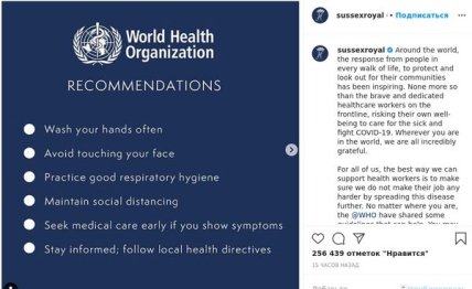 "Смелые и преданные медики на передовой эпидемии рискуют собственным благополучием и здоровьем, заботясь о больных и борясь с коронавирусом. Где бы вы ни были в мире, мы все вам безумно благодарны! Для всех нас лучший способ поддержать медицинских работников – это убедиться, что мы не усложняем их работу, распространяя эту болезнь дальше. Поэтому в ВОЗ поделились некоторыми рекомендациями, которые могут помочь. Вы, возможно, их видели или слышали раньше, но они сегодня важны, как никогда", – заявили герцоги Сассекские.