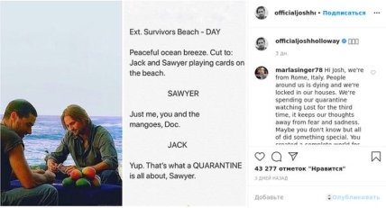 Умиротворяющий океанский бриз. Джек и Сойер играют в карты на пляже. Сойер: "Только ты, я и манго, док". Джек: "Ага. Вот что значит карантин, Сойер", — подписал кадр Джош. Он не упомянул имя Лилли, но выделил слово "карантин", — поклонники подозревают, что таким образом коллега намекнул Эванджелин на важность карантина и изоляции в эти дни.