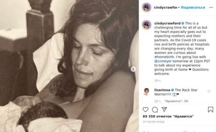 Легендарная супермодель Синди Кроуфорд опубликовала в Instagram редкие архивные кадры, сделанные во время родов.