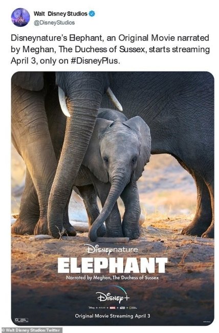 Уже 3 апреля на стриминговой платформе Disney+ стартует показ нового документального анимационного фильма Elephant, который озвучила Меган Маркл.