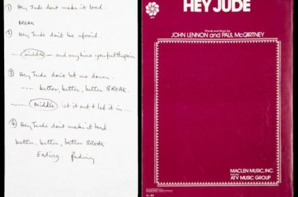 Листы с рукописным текстом песни Hey Jude группы The Beatles ушли с молотка на торгах, которые были проведены аукционным домом Julien's Auctions за 910 тысяч долларов. Как сообщается на сайте аукциона, оценочная стоимость лота составляла 160-180 тысяч долларов.