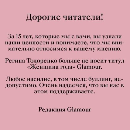 Тем временем, пользователи обратились к изданию Glamour с просьбой лишить Регину Тодоренко звания "Женщины года", коим она была удостоена в 2019 году. Вначале издатели заявили, что не могут так поступить с Тодоренко, поскольку за нее голосовали читатели. Однако позже представители Glamour сообщили, что все-таки лишают Регину титула.