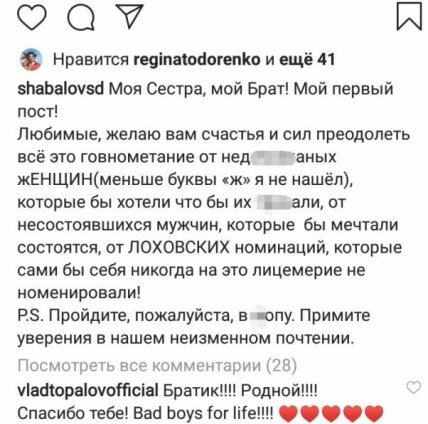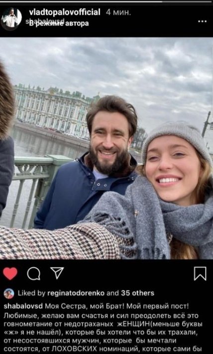 Тодоренко "лайкнула" этот пост, а ее супруг поблагодарил "братика" за поддержку. Более того, пост прокомментировал супруг Регины Влад Топалов, поблагодарив "братика" за поддержку. Также муж Тодоренко поделился этим постом в stories.