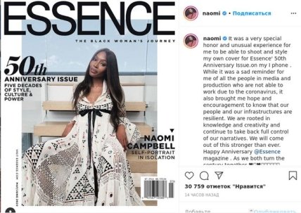 "Она была вынуждена найти быстрое решение в отсутствие традиционной фотосессии. И мисс Кэмпбелл взяла дело — и камеру — в свои руки. В частности, она сама сделала себе прическу и макияж, а также выступила своим стилистом, прежде чем включить объектив, чтобы сделать первую в истории обложку журнала Essence. Фотосессия была снята на iPhone. Кроме того, впервые за 50-летнюю историю журнала на обложке появились фото, сделанные самой моделью", — отмечает редакция глянца.