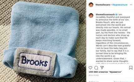 Я невероятно рада сообщить, что у нас родился сын, Брукс Рауш, который уже покорил наши сердца. Его появление стало возможным в немалой степени благодаря фронтовым героям — медсестрам и врачам, которые в это сложное время заботятся и о новой жизни. Словами не описать, как я благодарна за то, что этот малыш присоединился к нашей семье. Но, безусловно, нынешнее время — самое странное для того, чтобы принести в мир новую жизнь, — написала в микроблоге Мелисса.