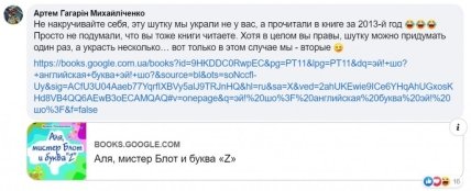 К своему ответу автор сценок "Квартала" добавил ссылку на книгу об английском алфавите, в которой выделил шутки, прозвучавшие в номерах обеих студий. "В целом вы правы, шутку можно придумать один раз, а украсть несколько… вот только в этом случае мы - вторые", - добавил Гагарин.