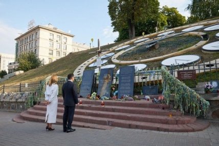 Вместе со своим супругом, президентом Украины Владимиром Зеленским, первая леди возложили цветы к памятному кресту на Аллее Героев Небесной Сотни и приняли участие в молебне за установление мира в Украине.