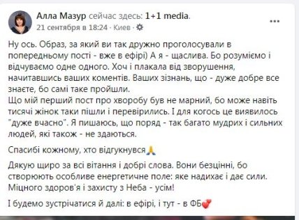 На страницах в социальных сетях - и в Фейсбуке, и в Инстаграме, Алла Мазур обратилась к своим фанатам, поблагодарив их за огромную поддержку, за плздравления и приятные слова в ее адрес.