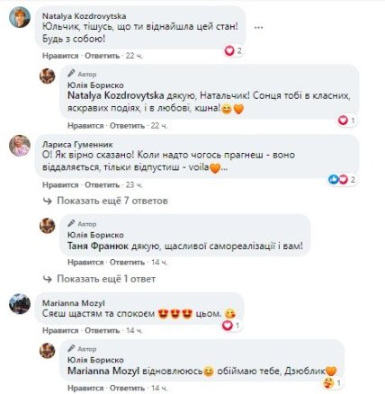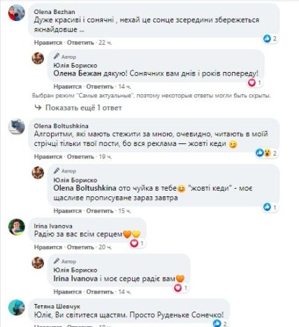 При все этом Бориско не теряет веры в лучшее. В своем аккаунте она пишет, что отыскала внутренние равновесие: "Разве это не лучшее, что может случиться со взрослым человеком?! И как его удержать?.. Впрочем, ответ очевиден: не удерживать! Остается только то, что не держишь".