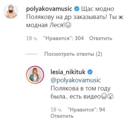 Выделилась и певица Оля Полякова, которая посоветовала на день рождение заказывать не Сердючку, а Полякову, ведь это сейчас модно. На ее комментарий Леся ответила, что Полякова была на прошлом дне рождения, что может доказать видео.