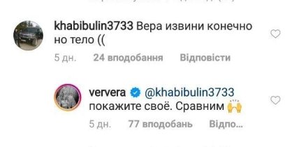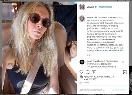 Однако не все так сложилось, как она хотела. Вместо восторженных отзывов о ее потрясающей фигуре, Вера получила негативную реакцию. В итоге фолловеры раскритиковали ее за отсутствие талии и за публикацию столь откровенных снимков.