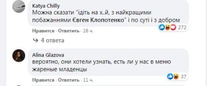 Подписчики Клопотенка присоединились к мнению повара и активно шутят в комментариях – «вероятно, они хотели узнать, есть ли у нас в меню жареные младенцы», «Хай щі лаптями сьорбають)», «Ну то класс... Можно відправити їм фільм "Борщ" Хай дивляться», «А вообще да, скажи, что интервью возможно в обмен на Крым и Донбасс».