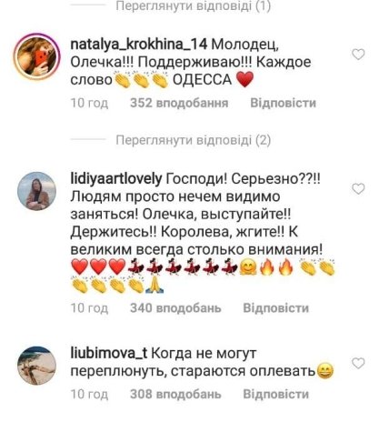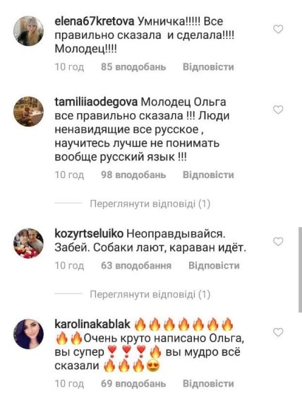 В комментариях многие начали поддерживать Полякову, отмечая, что те все слова сказаны из-за зависти и от безделья, а то и вообще, то все проплаченные отзывы. «Людям просто нечем видимо заняться! Олечка, выступайте!! Держитесь!! Королева, жгите!!», «Когда не могут переплюнуть, стараются оплевать», «Как всегда смело и честно!», «Людям некуда деть свой негатив,а тут снова Полякова да ещё и с супостатом» - пишут фаны.