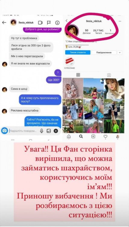 Дело вот в чем – с одной из таких фан-страниц, вымогают деньги за пост от Леди Ле. Всего за 300 грн телеведущая якобы опубликует Вашу рекламу у себя на страничке. Так, как были случаи, что люди скидывали эти деньги, Леся Никитюк предупреждает, что это неправда.
