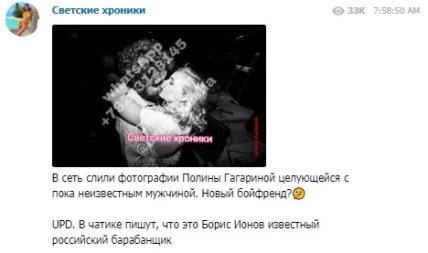 "В сеть слили фотографии Полины Гагариной целующейся с пока неизвестным мужчиной. Новый бойфренд? UPD. В чатике пишут, что это Борис Ионов известный российский барабанщик", - сообщается на канале.