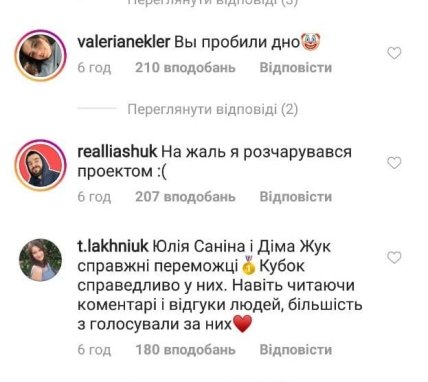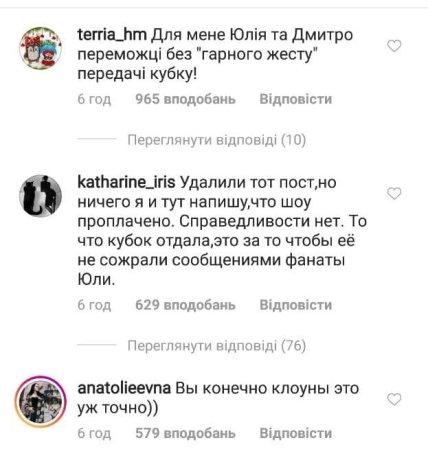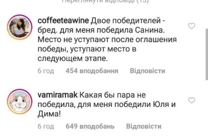 Многие зрители шоу «Танцы со звездами» и армия поклонников группы The Hardkiss и Юлии Саниной считают такой финал нечестным. В комментариях под постом с именами победителей организаторов шоу обвиняют в продажности, нечестном подборе участников и подсчете голосов.