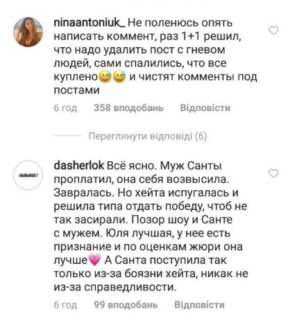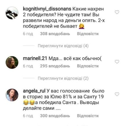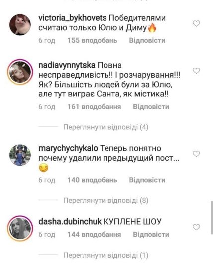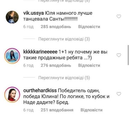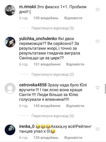 «Уважаемый канал, вы когда выбираете звёзд на это шоу, то потрудитесь хоть Википедию почитать, где написано, что Санта мастер спорта по бальным танцам», «1+1 самое продажное шоу Украины», «Цирк», «Дно - пробито», «Фууу 1+1», «Какие нахрен 2 победителя? Не чудите там! Вы развели народ на деньги опять. 2-х победителей не бывает», «Юля танцевала намного лучше Санты», «Хип-хоп все показал», «Не поверю, что за Санту проголосовало больше людей, чем за Юлю» - пишут разгневанные зрители.