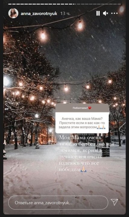 "Моя мама очень тяжело болеет, но мы лечимся, верим в лучшее, и я очень надеюсь, что все победим", - написала Анна Заворотнюк.