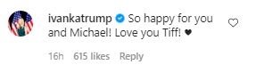С помолвкой также поздравила сестра Тиффани - Иванка Трамп: "Так рада за тебя и Майкла! Люблю тебя, Тифф!"